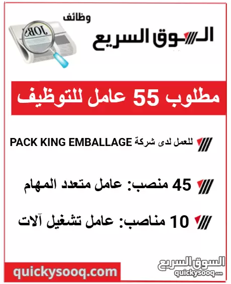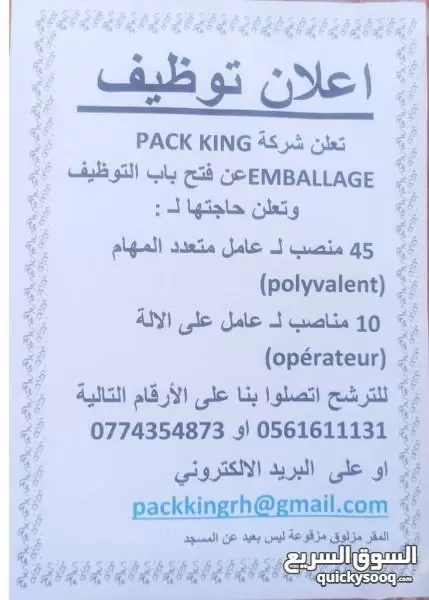 تُعلن شركة PACK KING EMBALLAGE عن فتح باب التوظيف، وتُعلن عن حاجتها إلى: